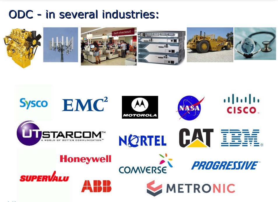 ODC has been applied in several industry verticals. What began with software development, then grew into multi-product organizations has now been applied in IT Servivces. Clients use ODC on call-center issues dealing with what can be termed "non-defect", such as help desk. On the technology stack there are applications in database, networks, storage, operating systems, applications and device controllers. One of the less known application is hardware. Several recent clients are in companies that have applications that deal with warehousing, procurement, insurance etc.