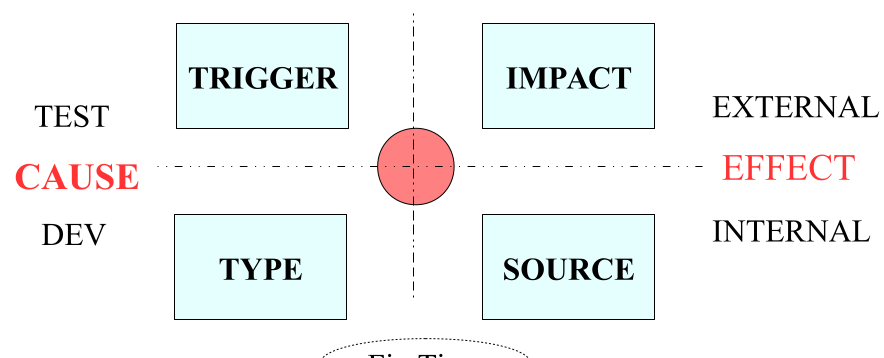 The red dot in the center represents the defect, or change, or issue, or delta. The semantic information in this delta/defect is extracted into categories represented by these four primary dimensions. These data are related to each other on a per event basis. The data is not analyzed on a per event basis but is aggregated over other dimensions such as time, release, product, sikll group or customer groups.